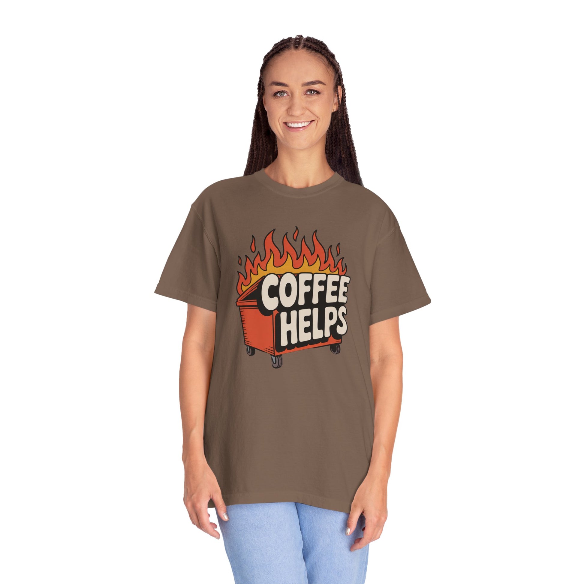 This T-shirt wears its humor loud and honest — a laid-back, lived-in tee for anyone whose mornings (or years) have felt like a bit of a dumpster fire, but coffee still gets them moving. The soft, garment-dyed cotton settles into the body with a comfortable relaxed fit. The cheeky “Dumpster Fire but Coffee Helps” vibe reads like a knowing nod to fellow caffeine devotees who meet chaos with dark humor and a steady mug in hand. Wear it to slow mornings at the café, messy creative sessions, weekend errands, or casual nights with friends — it’s the kind of shirt that sparks a laugh and starts conversations without shouting.